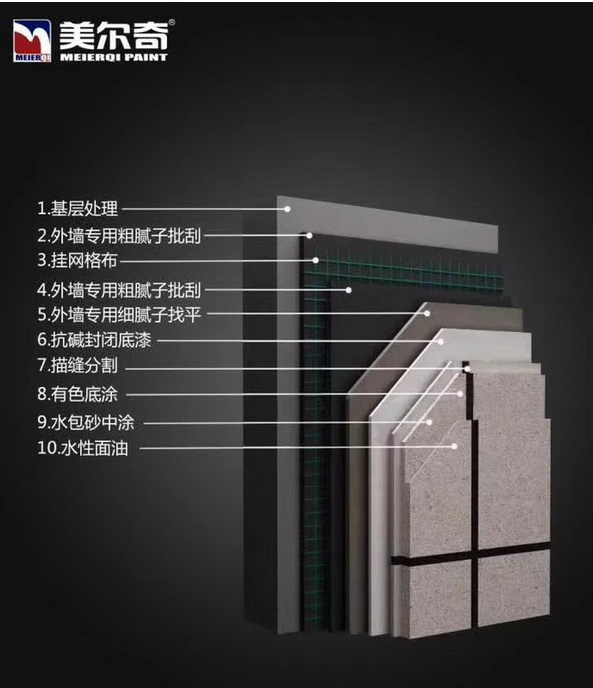 基層處理→外墻專用粗膩子批刮→掛網(wǎng)格布→外墻專用粗膩子批刮→外墻專用細膩子找平→抗堿封閉底漆→描縫分割→有色底涂→水包砂中涂→水性面油