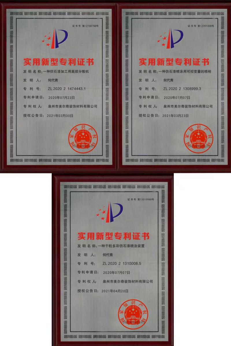 與福州大學(xué)、中科院材料所共建仿石漆聯(lián)合實驗室,仿石漆噴涂用可控變量的噴槍、仿石漆加工用高效分散機等前沿領(lǐng)域,累計申請專利13項,其中發(fā)明專利占比達65%。