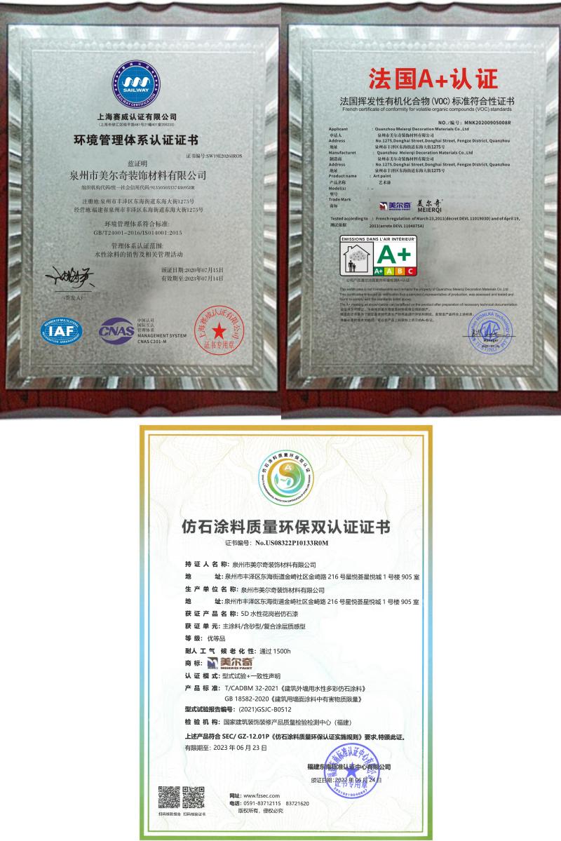 采用超臨界CO₂發(fā)泡技術(shù)替代傳統(tǒng)溶劑揮發(fā)工藝,減少90%揮發(fā)性有機物(VOCs)排放,產(chǎn)品通過法國VOC A+認(rèn)證、環(huán)境管理體系認(rèn)證證書、仿石涂料質(zhì)量環(huán)保雙認(rèn)證證書。