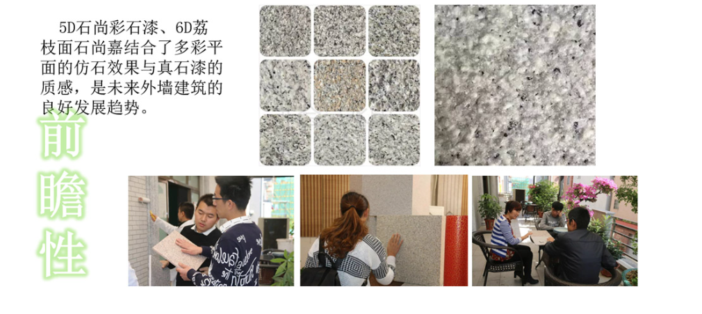 5D石尚彩石漆、6D荔枝面石尚嘉結(jié)合了多彩平面的仿石效果與真石漆的質(zhì)感,是未來外墻建筑的良好發(fā)展趨勢。