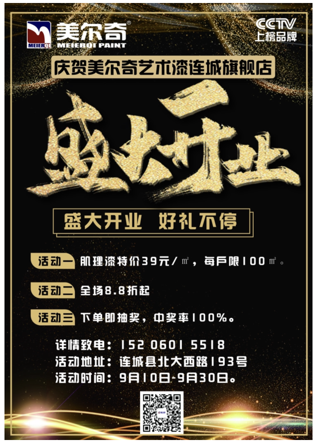 為了適應(yīng)多元化的消費(fèi)趨勢(shì),更好地服務(wù)廣大消費(fèi)者,美爾奇藝術(shù)漆連城服務(wù)中心經(jīng)過(guò)充分的醞釀和緊張的籌備工作后,于9月10日在連城建材街舉行盛大的開(kāi)業(yè)典禮儀式。