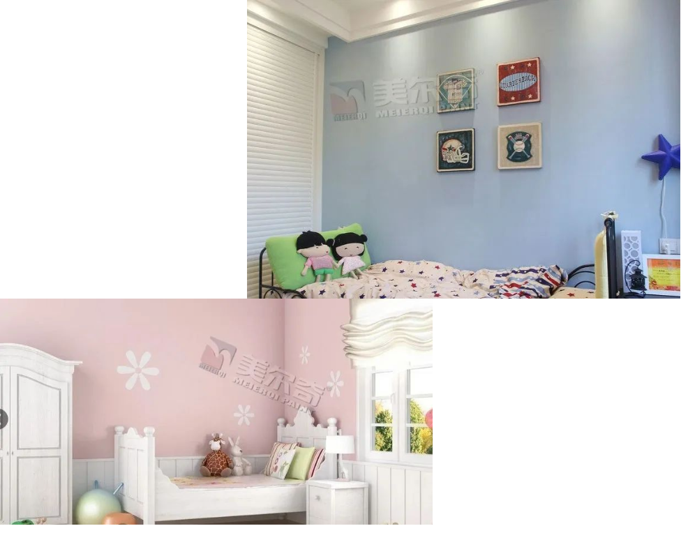 兒童房多采用明亮色彩的藝術(shù)涂料裝飾,蛋殼光、天鵝絨就是不錯(cuò)的選擇,其具有絲絨質(zhì)感、手感細(xì)膩、珍珠光澤、質(zhì)地柔和,色彩感強(qiáng)、不褪色、耐污性高,與孩子活潑靈動(dòng)的性格相呼應(yīng)。用肌理漆做上花朵動(dòng)物等等印花效果的造型,也是相當(dāng)?shù)那纹た蓯邸?/span>