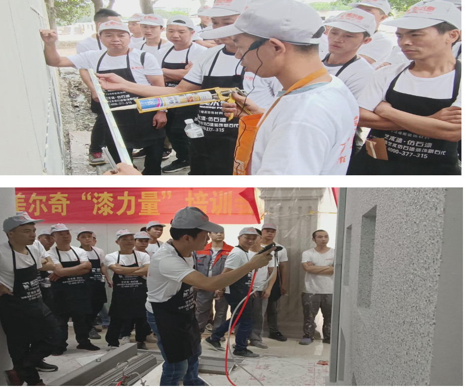 除了經(jīng)銷商門店突圍的思維點(diǎn)撥,工匠的實(shí)操培訓(xùn),也是此次漆力量商學(xué)院培訓(xùn)的一大亮點(diǎn)。區(qū)別于以往單項(xiàng)的實(shí)操培訓(xùn),此次工匠培訓(xùn)以提升綜合技能為目的,開設(shè)了圍繞外墻EPS構(gòu)件安裝、新工藝教學(xué)、仿石漆新品實(shí)操以及圍繞內(nèi)墻多款藝術(shù)漆主流產(chǎn)品實(shí)操教學(xué),真正做到將外墻一體化以及內(nèi)墻一體化相結(jié)合的模式,大大提升了工匠的綜合技能,打破了工匠以往技能單一的局面。此次工匠培訓(xùn)采用縮小版別墅實(shí)體為單位分組,各小組負(fù)責(zé)整棟別墅的內(nèi)外墻施工。在3天的培訓(xùn)時(shí)間內(nèi),通過工匠的巧手將毛坯的別墅實(shí)體演變成了一棟棟讓人嘆為觀止的精品。值得一提的是,此次藝術(shù)漆實(shí)操還加入了多款公司最新開發(fā)的藝術(shù)漆新品,其中微貝石和紫云煙這兩款產(chǎn)品,深受此次參訓(xùn)工匠的青睞,不僅成品效果突出,適用于大多數(shù)生活場景,而且在施工便利性方面,更是深受工匠們的喜愛。