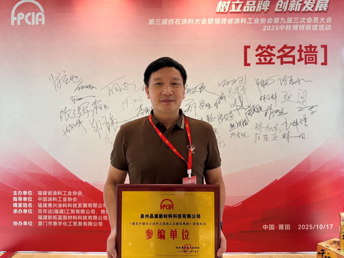 2025年10月17日,福建省涂料工業(yè)協(xié)會(huì)主辦的2025年第三屆仿石漆涂料大會(huì)第九屆三次會(huì)員大會(huì)暨福建省涂料工業(yè)協(xié)會(huì)藝術(shù)涂料分會(huì)成立大會(huì)在莆田舉行。本次大會(huì)以“樹立品牌創(chuàng)新發(fā)展”為主題,匯聚了來自政府、行業(yè)協(xié)會(huì)、企業(yè)及專家學(xué)者等各界代表,共同探討仿石涂料行業(yè)發(fā)展趨勢、技術(shù)創(chuàng)新及產(chǎn)業(yè)鏈協(xié)同,推動(dòng)福建乃至中國涂料工業(yè)邁向新高。